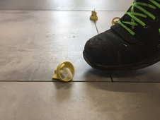 - Po zatvrdnutí lepidla (NE dříve !!!)se jednoduše kopne do kloboučků ve směru spáry a dojde k odlomení spony. Při pokládce dlaždic na stěny se s výhodou používá k odlomení spony obkladačská palička.
