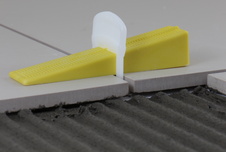 - Po zatvrdnutí lepidla (NE dříve !!!)se jednoduše kopne do klínků ve směru spáry a dojde k odlomení spony. Při pokládce dlaždic na stěny se s výhodou používá k odlomení spony obkladačská palička.