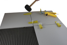 - Po zatvrdnutí lepidla (NE dříve !!!)se jednoduše kopne do klínků ve směru spáry a dojde k odlomení spony. Při pokládce dlaždic na stěny se s výhodou používá k odlomení spony obkladačská palička.